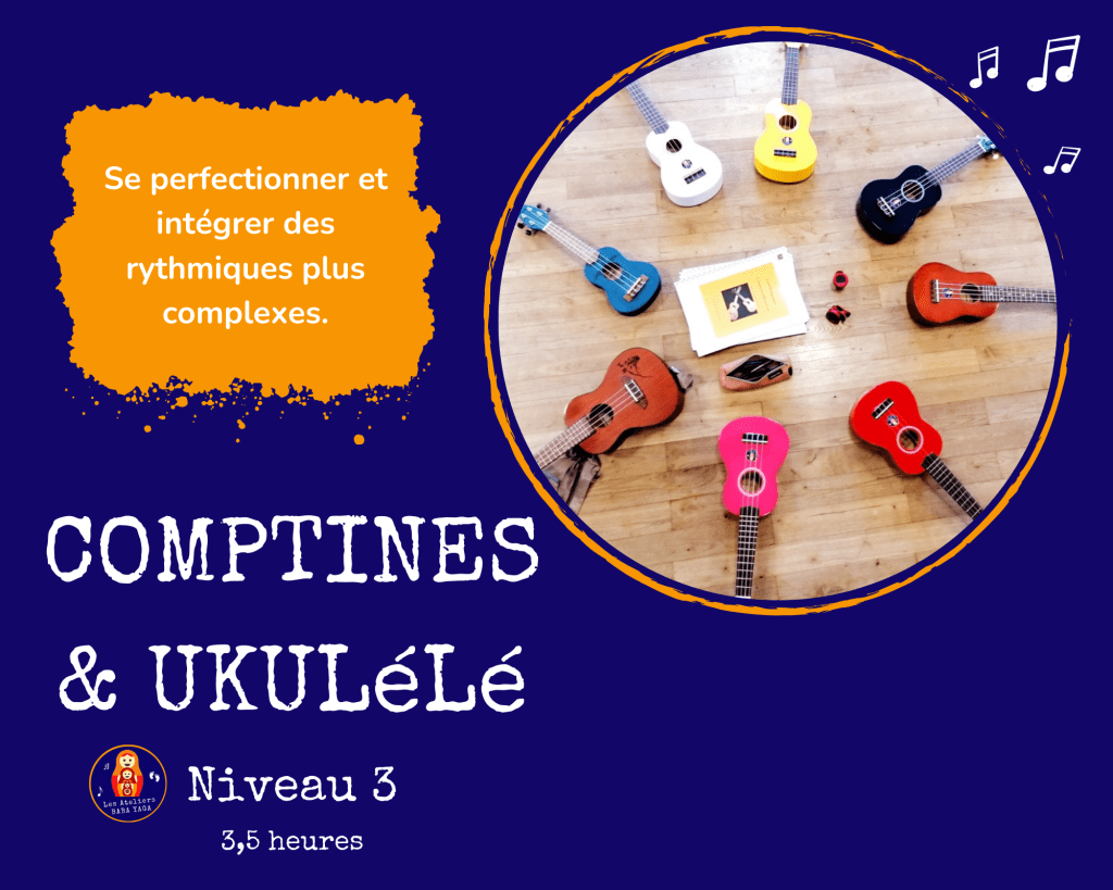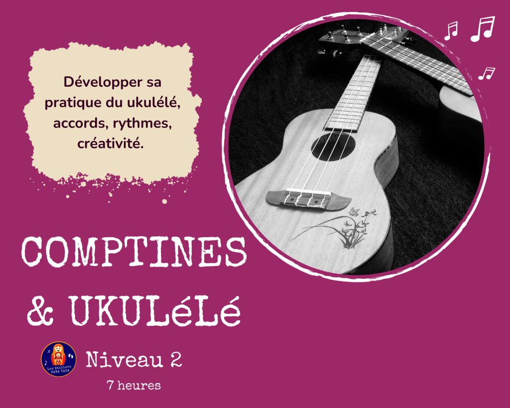 3 niveaux de stages et un atelier d’initiation à destination des professionnel.le.s de la petite enfance, enfance, du soin, de la culture, des parents, grand-parents, particuliers, pour débuter le ukulélé et développer son répertoire de comptines dans un objectif d’utilisation professionnelle ou personnelle.