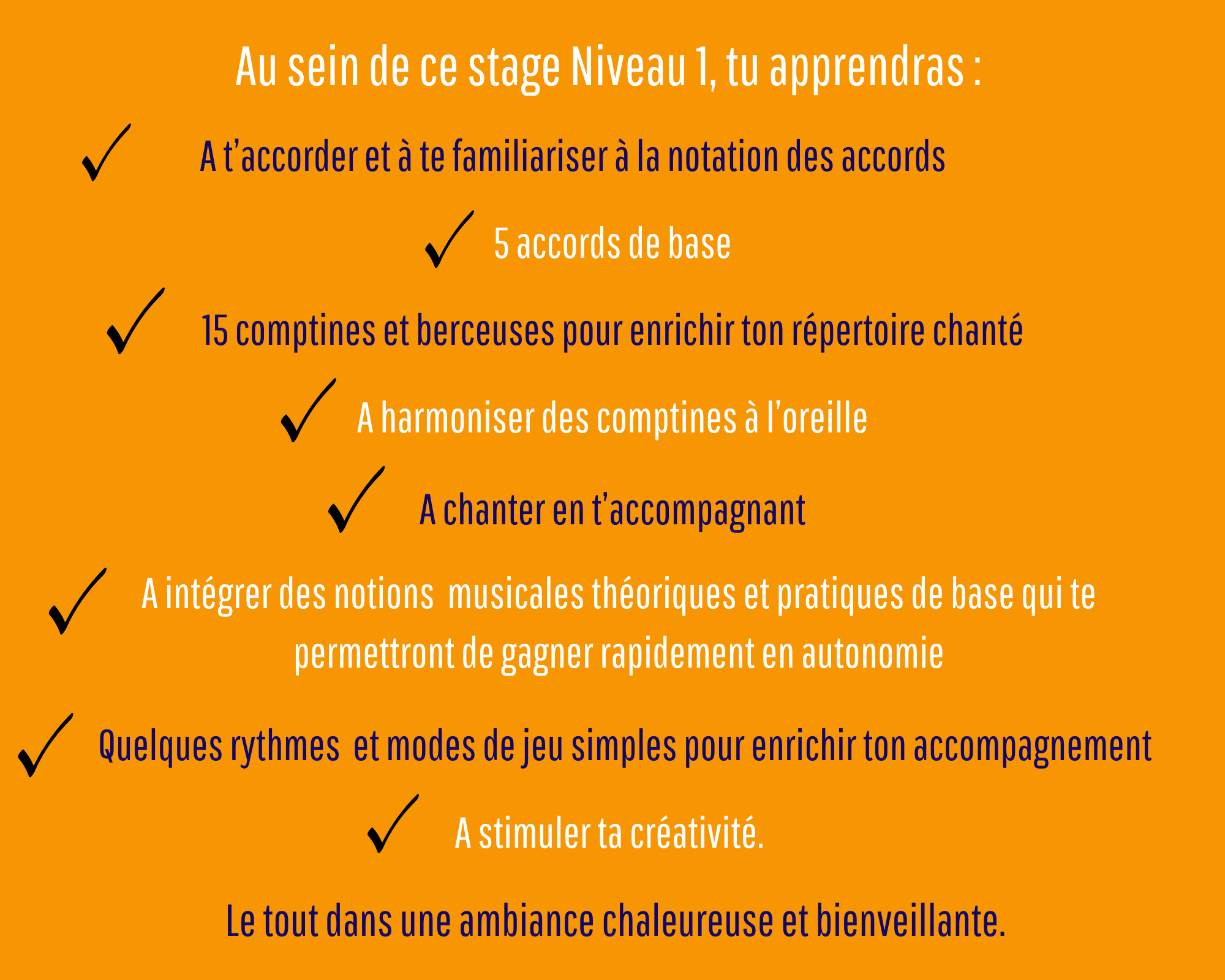 - Vous repartez avec le livret des comptines & berceuses (avec les accords de ukulélé) apprises en atelier et quelques-unes en bonus), un fichier audio des chants appris sur l’atelier, ainsi que la planche de tous les accords afin que vous puissiez enrichir votre pratique dans un second temps chez vous, si vous en avez envie.