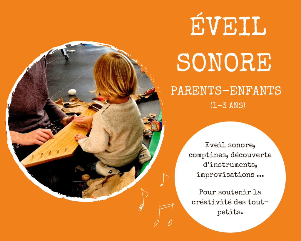 Ces ateliers offrent un temps de jeu axé sur la relation parents-enfant au moyen d’improvisations spontanées, de partages sonores, chantés et instrumentaux.