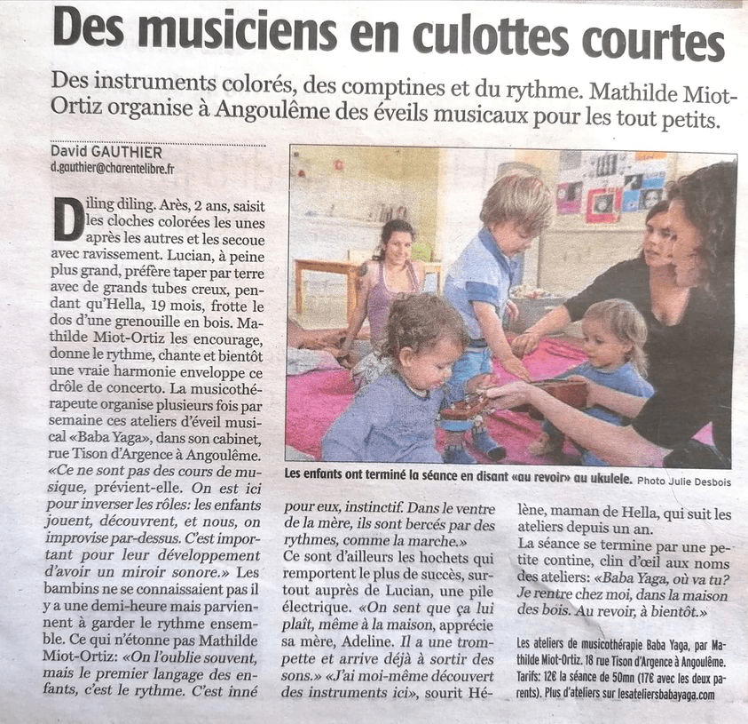 - Juillet 2020 – Article paru dans la Charente Libre : « Des musiciens en culottes courtes » présentant les ateliers d’éveil sonore parents-enfants – David Gauthier et Julie Desbois.