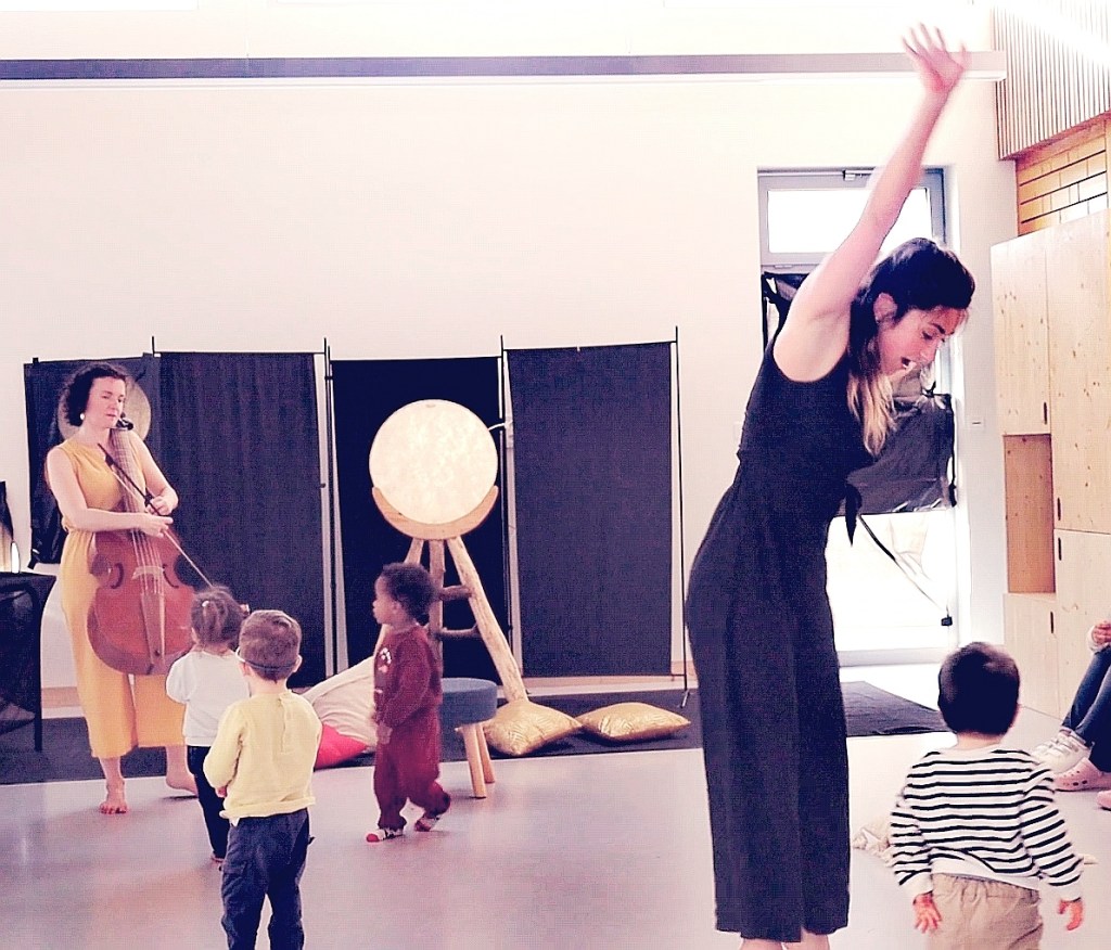 Mais aussi propositions sonores, dansées, poétiques, chantées, bercées, issues des spectacles à réactions libres, de compositions inédites, ou du répertoire traditionnel d’ici et d’ailleurs. L’artiste joue avec ce qui surgit dans l’instant dans la relation artiste-enfant-parent, et invite les familles présentes à en faire de même.