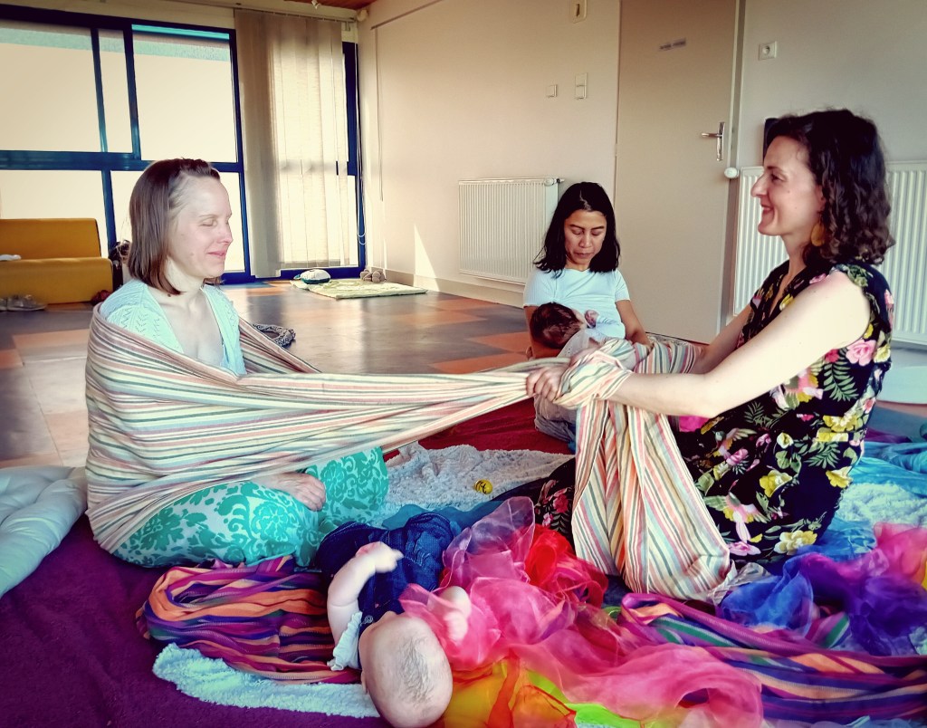 Pour aider le bébé à retrouver les sensations in utero ; pour transmettre les berceuses de son histoire ; pour que la voix et le tissu se fassent tisseurs de lien entre le dedans et le dehors ; pour envelopper le passage de tendresse.